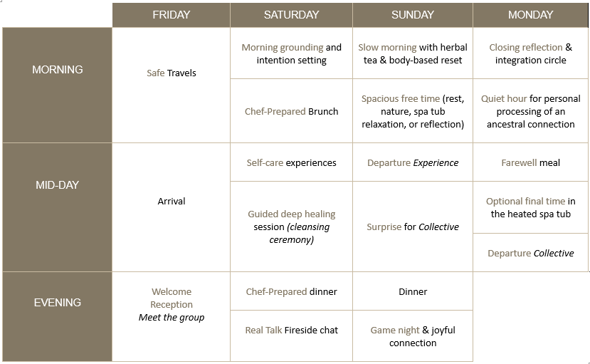 ✔️ Self-Care & Restoration Time – Spacious moments intentionally built in for rest, reflection, and unstructured ease.